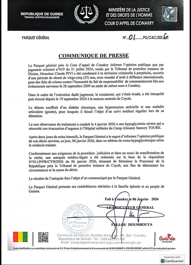 Le Parquet général près la Cour d’appel de Conakry a annoncé, ce lundi 6 janvier 2026, le décès en détention de Claude Pivi, ancien haut responsable militaire, condamné à la réclusion criminelle à perpétuité pour crimes contre l’humanité.